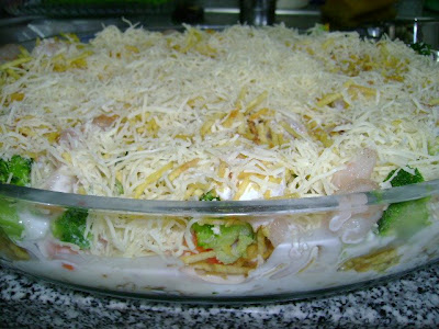 Numa tigela misturo o bechamel com as natas e tempero generosamente de pimenta e noz moscada, sal ponho só um pouco. Cubro o fundo do pirex com um pouco do molho e depois vai tudo lá para dentro sem nenhuma ordem especifica. Quando já lá estão todos os ingredientes, cubro com o molho na totalidade e deito o queijo por cima.