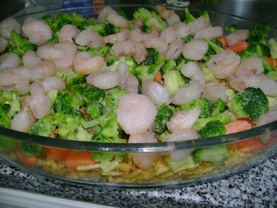 (o bacalhau, o camarão, broculos, cenoura, tomate, cebola e couve flor são daqueles comprados já cortados em pacotes prontos a usar. É tudo usado em cru e congelado conforme sai do congelador)