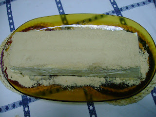 Preencha a forma alternando as camadas. Leve ao congelador durante algumas horas, até ficar bem firme. Desenforme, elimine a película aderente e polvilhe com a bolacha triturada.