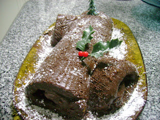 E agora a minha primeira experiência no tronco de Natal. Quero dizer-vos que fiz uma receita duma "Mulher Moderna na Cozinha" e que o tronco ficou horrivel, a massa ficou altíssima partiu-se toda a enrolar e por outro lado o creme para a cobertura e recheio ficou liquido e sem grande hipótese de recuperação.