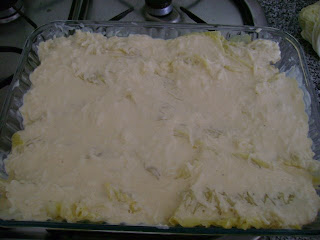 Num pirex pusemos os cannellonis uns ao lado dos outros e como sobraram ainda algumas folhas de couve, tapamo-los com elas. Em seguida deitei o molho que tinha feito de forma a cobrir bem todo o pirex e polvilhei com queijo grana padana ralado.