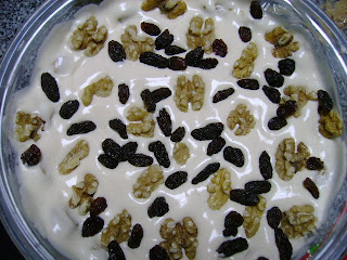 Disponha o creme nas taças (eu não fiz em taças individuais, fiz uma grande) em camadas alternadas com os palitos embebidos em café, até finalizar os ingredientes. Enfeitar com miolo de noz e sultanas e servir fresco.