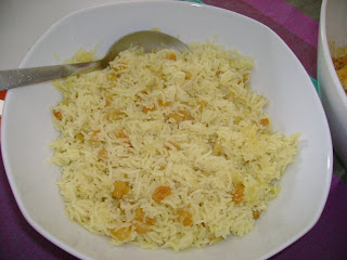Refogar a cebola em margarina. De seguida deitar-lhe o arroz, as passas e os pinhões e deixar fritar um pouco.