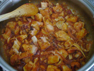 Depois fiz um refogado com cebola, alho, pimenta, azeite e o bacon. Quando juntei o vinho branco lembrei-me de juntar polpa de tomate e nesse caso a agua levaria dissolvido um cubo de caldo de peixe ou marisco, mas não tinha polpa de tomate. Assim, lembrei-me de abrir um frasco de molho bolonhesa e substitui a polpa e o cubo por uma porção generosa daquela pasta.