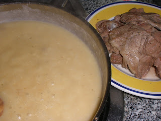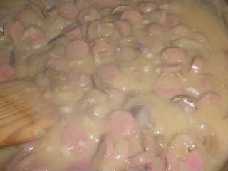 Temperar as costeletas com sal e pimenta, alourar na banha e tira-las para um prato. Escorrer o molho da banha e derreter depois a Becel com o alho picado, polvilhar com a farinha e envolver bem. Misturar depois o vinho e o caldo de carne, deixar ferver e engrossar um pouco. Depois juntar as salsichas e os cogumelos. Juntam-se as costeletas e deixam-se acabar de cozinhar. Acompanhei com puré de batata e pickles cortadinhos por cima das costeletas (dá um sabor optimo e desenjoativo).