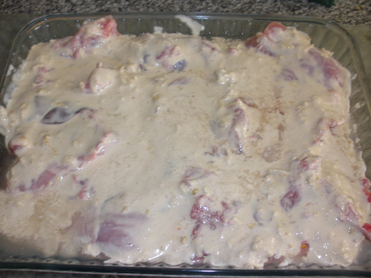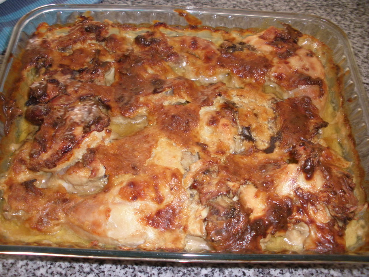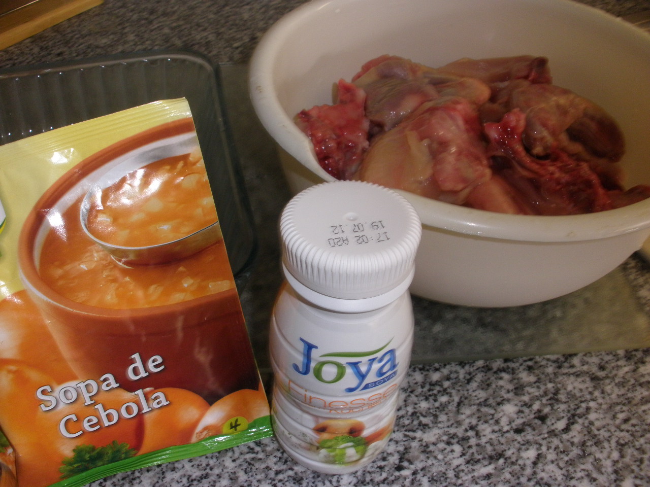 Misturei a sopa de cebola com as natas e dois gindungos. Espalhei o frango no tabuleiro, reguei com vinho branco e despejei a mistura por cima.