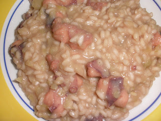 Adicione 100 gr. de vinho do Porto, o arroz e o sal. Passe o caldo da cozedura para o copo pesando, e adicione agua até perfazer 700 gr. e coza 8 min. / 100 graus / pas invertidas / vel. colher de pau.