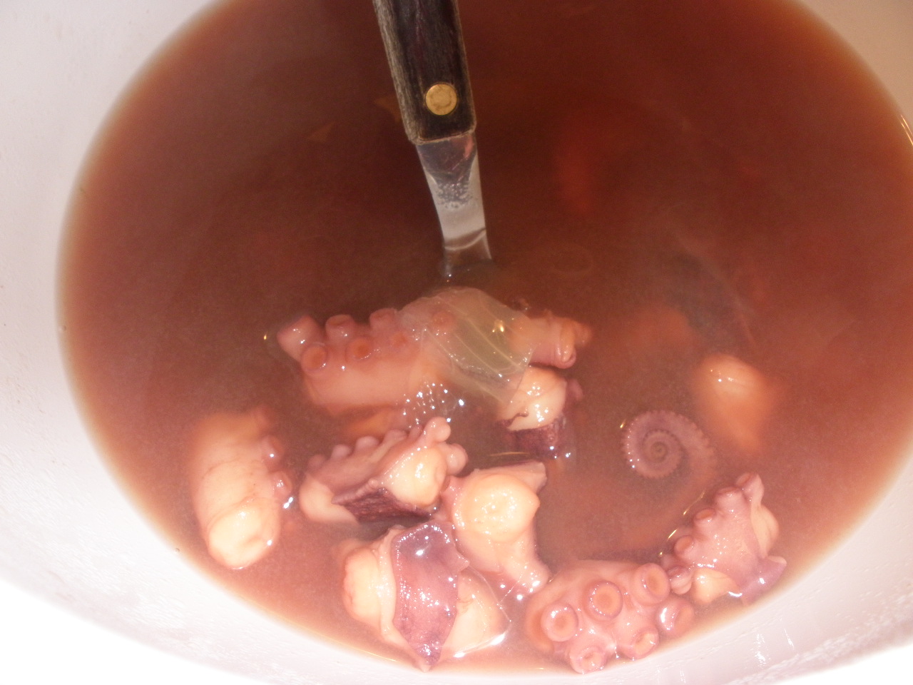 No copo limpo, coloque o polvo, a cebola, 50 gr. de vinho do Porto e a água (foi aqui que eu não percebi se eram os 100 gr. ou a quantidade suficiente para cozer, mas como achei 100 gr. pouco, pus 400 gr. e correu bem) e coza 35 min /Varoma / vel. 1. Retire e reserve o polvo e a agua da cozedura.