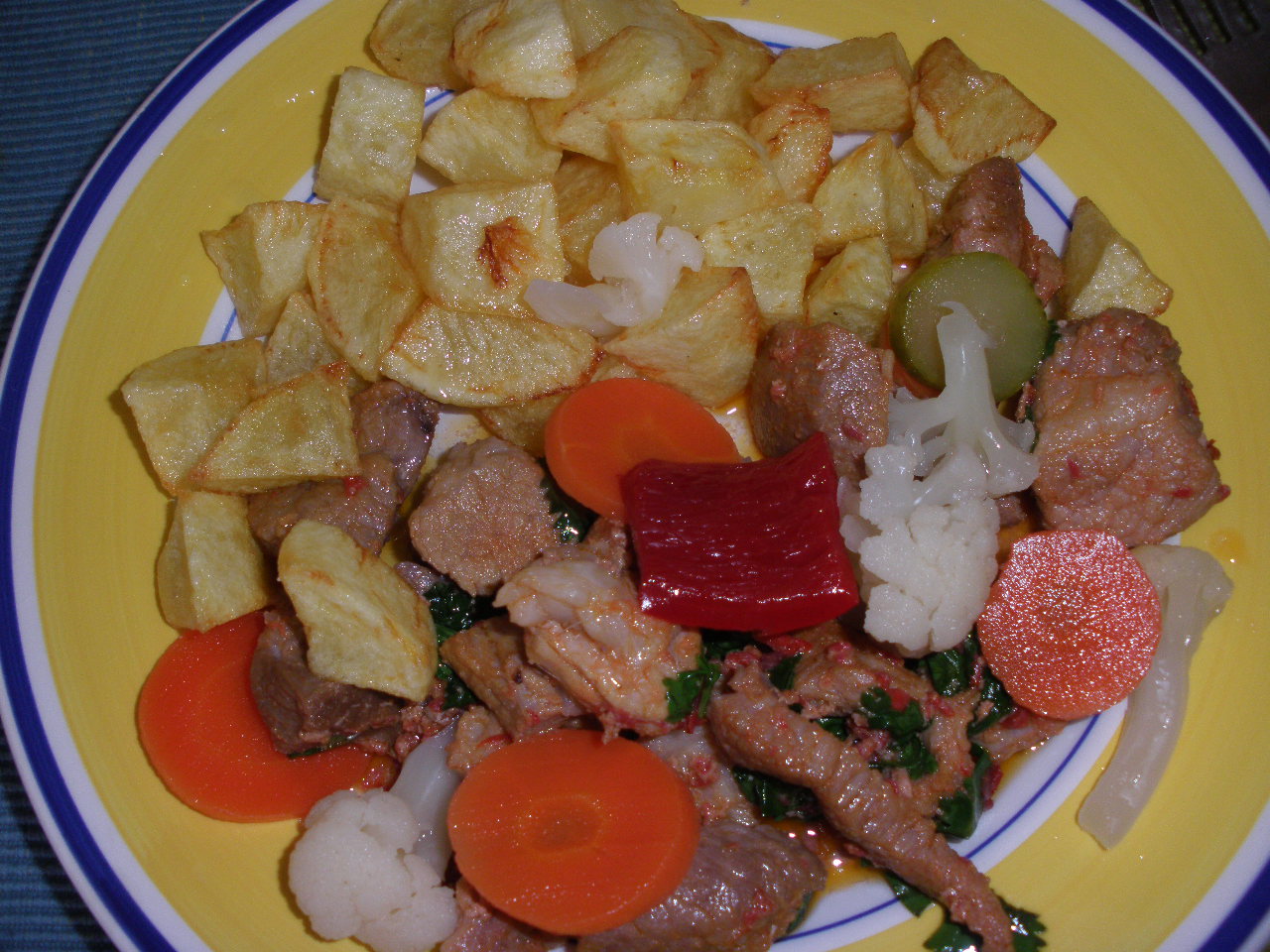 Tempero a carne com massa de alho e pimentão, que nunca faltam cá em casa. Sabores muito portugueses quer saem quando a ideia é cozinhar pratos muito portugueses.Ponho tambem cerca de um copo de vinho branco. Entretanto podem-se ir fritando as batatas, cortadas em cubos.