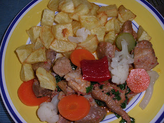 Num tacho ponho o azeite (forro o tacho), a folha de louro e pimenta, deixo alourar. Depois junto a carne e deixo fritar. Quando está frita (sem queimar) junto a marinada da carne e deixo acabar de cozinhar.
