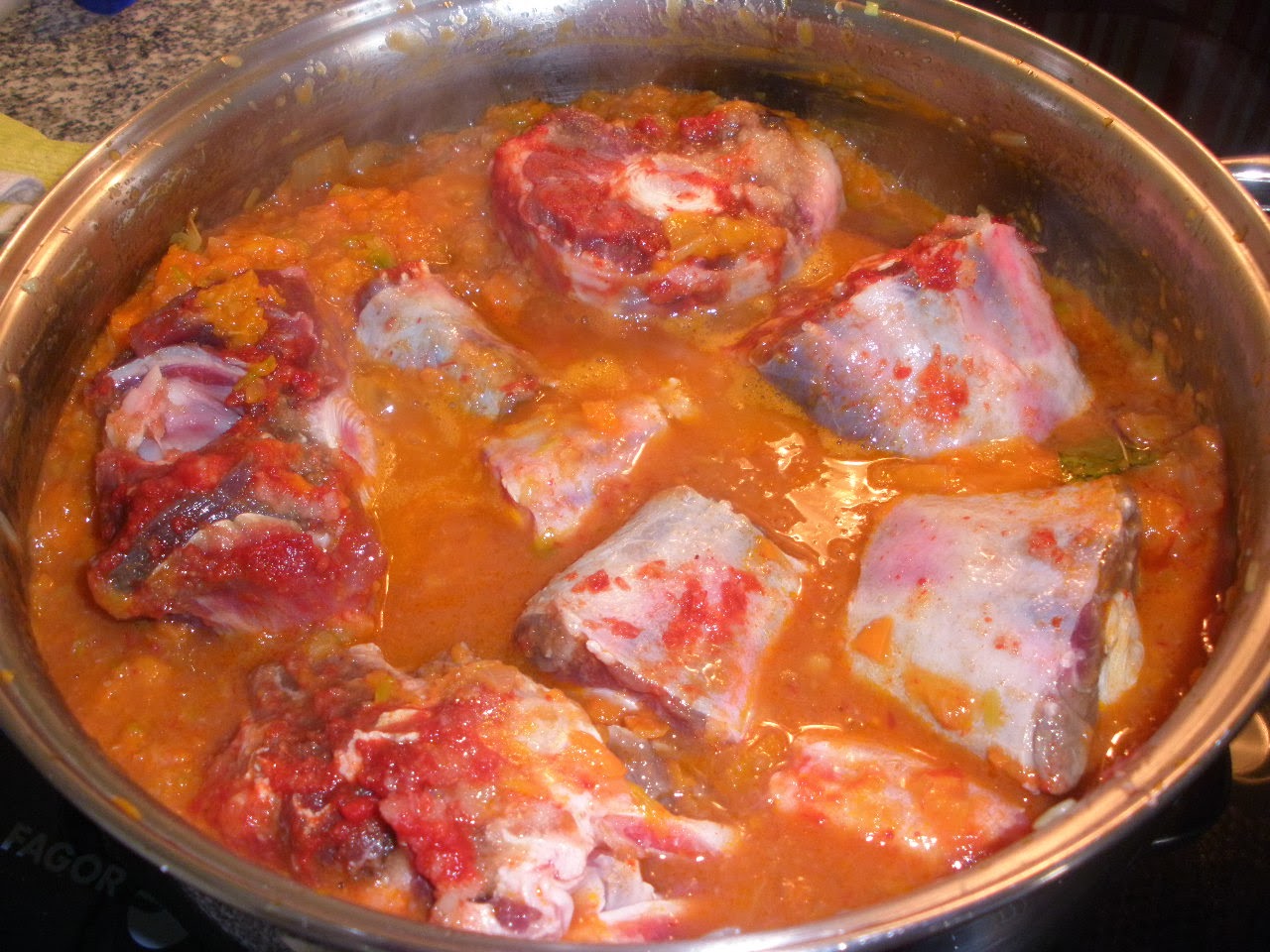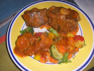Depois de pronto rectificam-se os temperos, retira-se e corta-se aos pedaços que se dispõem numa travessa com o molho por cima. Acompanha com puré de batata e couve-flor gratinada. Hoje acompanhei com legumes cozidos.