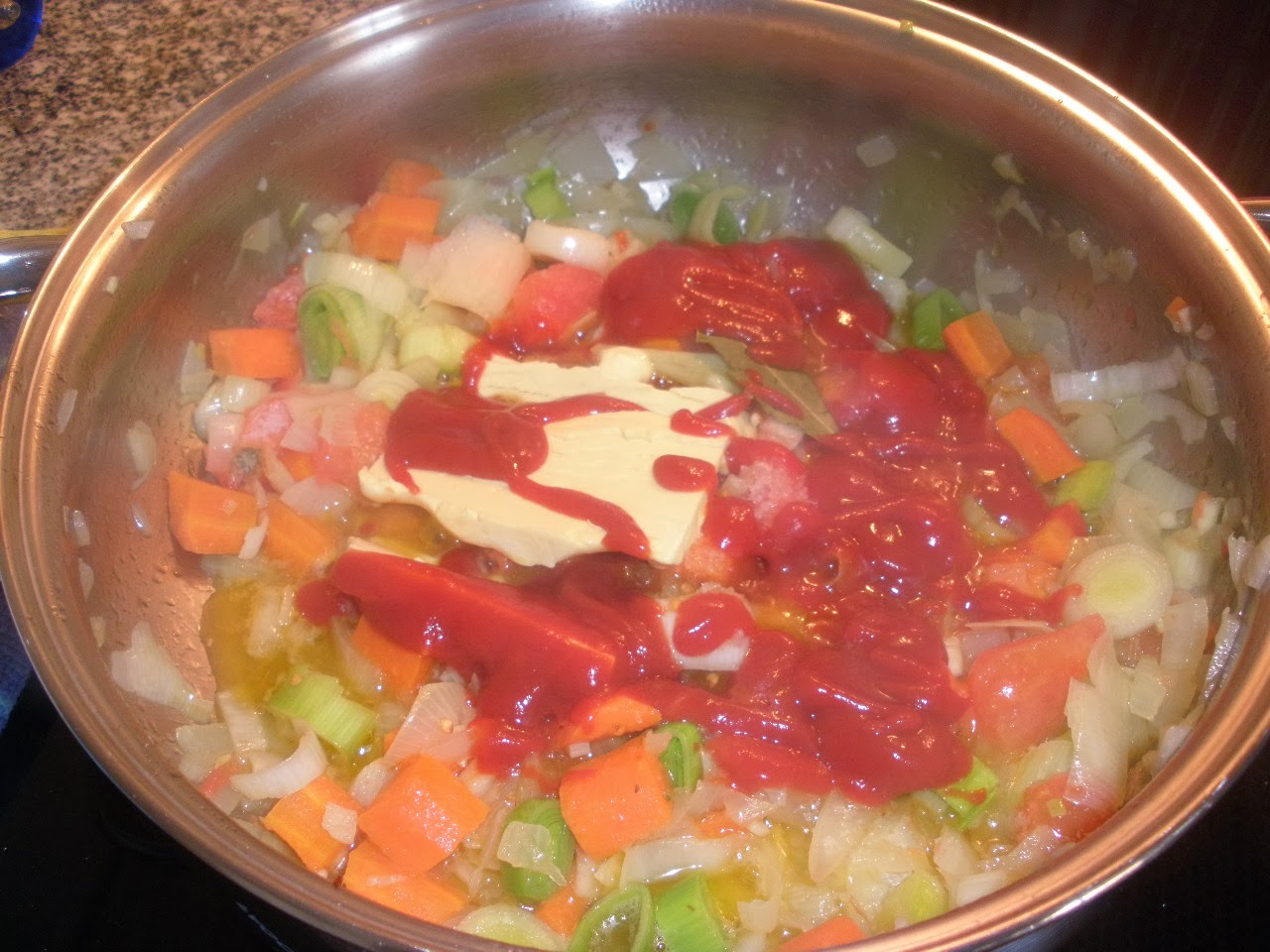 Num tacho coloca-se a cebola picada, os dentes de alho cortados, o alho francês, a cenoura, os tomates sem peles nem pevides, o concentrado de tomate, a folha de louro, as gorduras e deixa-se refogar.